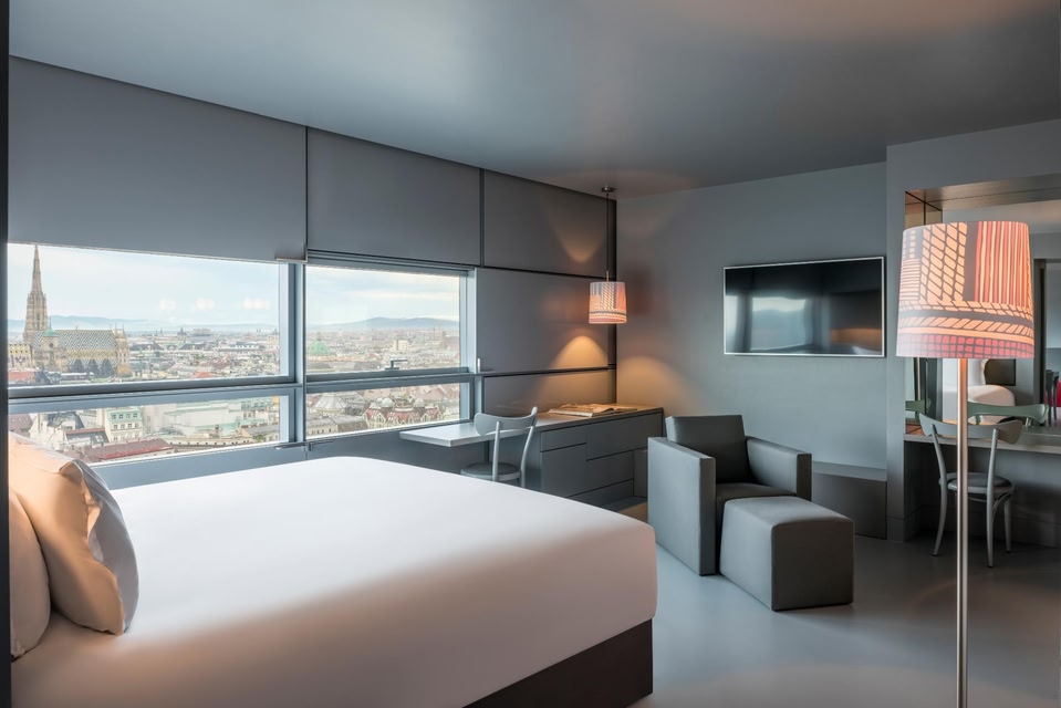 Designed by the famous architect Jean Nouvel, this stylish hotel offers panoramic views over Vienna, a gourmet restaurant, a gym, and a 750 m² spa area where guests can relax free of charge.