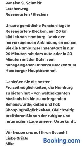Ferienwohnung Schmidt is located in Rosengarten, 30 km from Dialog im Dunkeln, 30 km from Miniatur Wunderland, and 31 km from Elbphilharmonie Hamburg. This apartment features free private parking, bicycle parking and free WiFi.