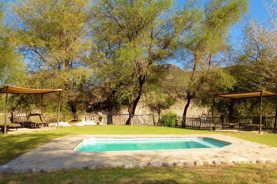 Khowarib Lodge features an outdoor swimming pool, garden, a terrace and restaurant in Khowarib. This 3-star hotel offers a bar. All rooms come with a patio. At the hotel, the rooms are equipped with a desk.